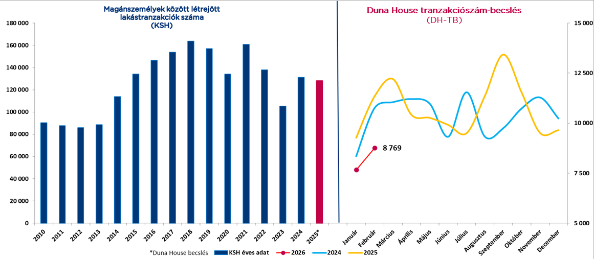 A DH Group havi tranzakciószám-becslése (DH-TB) és jelzáloghitel-előrejelzése alapján 2026 februárjában országosan 8 769 lakóingatlan cserélt gazdát, a lakáscélú jelzáloghitelek szerződéses összege pedig elérhette a 250 milliárd forintot.